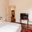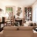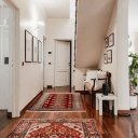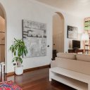 LIVING ROOM:The lounge, centered around a stone fireplace, two sofas, and surrounded by bookshelves, invites cozy and relaxing evenings. Dark parquet floors and oriental rugs add warmth, while large windows illuminate the minimalist design blended with classic details. The dining area, with its glass table and modern chairs, is perfect for enjoying a glass of local wine.