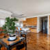 Crossing the driveway gate, to welcome us is the wide driveway that divides the front garden, perfectly maintained. Entering through the main door, the open plan living room opens up in front of us: on one side we have a comfortable sofa placed in front of a large fireplace that warms the room, and allows us to enjoy the view we have of the front garden thanks to the glass window that occupies the entire wall; while on the other side we have an area used more as a dining room, with a large table and custom-made furniture. But the real added value is the olive wood parquet, installed in herringbone pattern, which makes the room even more elegant and sophisticated. Access to the large furnished veranda is provided by a glass window with a sliding door.