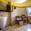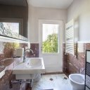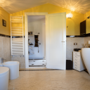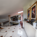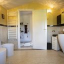 The finishes are all fine marble, among which we can recognize “breccia toscana“ in the bathroom on the ground floor, “trambiserra“ in the kitchen, “bianco gioia“ on the staircase leading to the upper floor, and the floors are “bianco gioia with red collemendina inlays.“