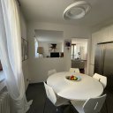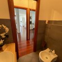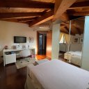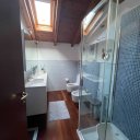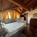On the ground floor is a bright living room with dining area and direct access to the porch for outdoor relaxation, an eat-in kitchen, a guest bathroom, and the first bedroom on the first floor.